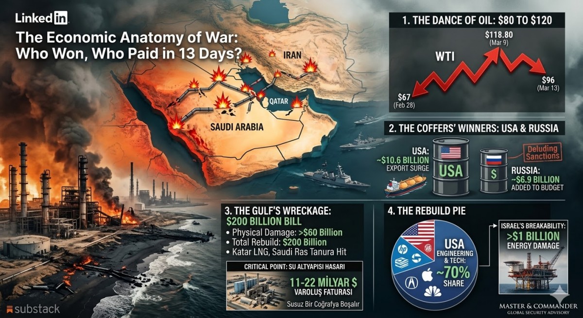 … KÖRFEZ SAVAŞININ GÜNCEL EKONOMİK ANATOMİSİ İlk 13 Günde Kim Kazandı, Hesabı Kim Ödedi? 28 Şubat 2026: Küresel enerji piyasaları için bir milat. İran-İsrail savaşının üzerinden henüz 13 gün geçmesine rağmen ortaya çıkan bilanço, bir asırlık değişimin ağırlığını taşıyor. Stratejik ...