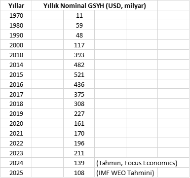 Kişi başına düşen GSYH’ya baktığımızda, bu sayının son 10 yılda yüzde 77 oranında azaldığını görmekteyiz. Bir diğer anlatımla, 2014’te 15 bin 900 dolar olan bu parametre şimdilerde 4 bin dolara gerilemiştir. (2023, 2024 ve 2025’te sırasıyla 2.738,  4.019, 4.122 dolar)[3]