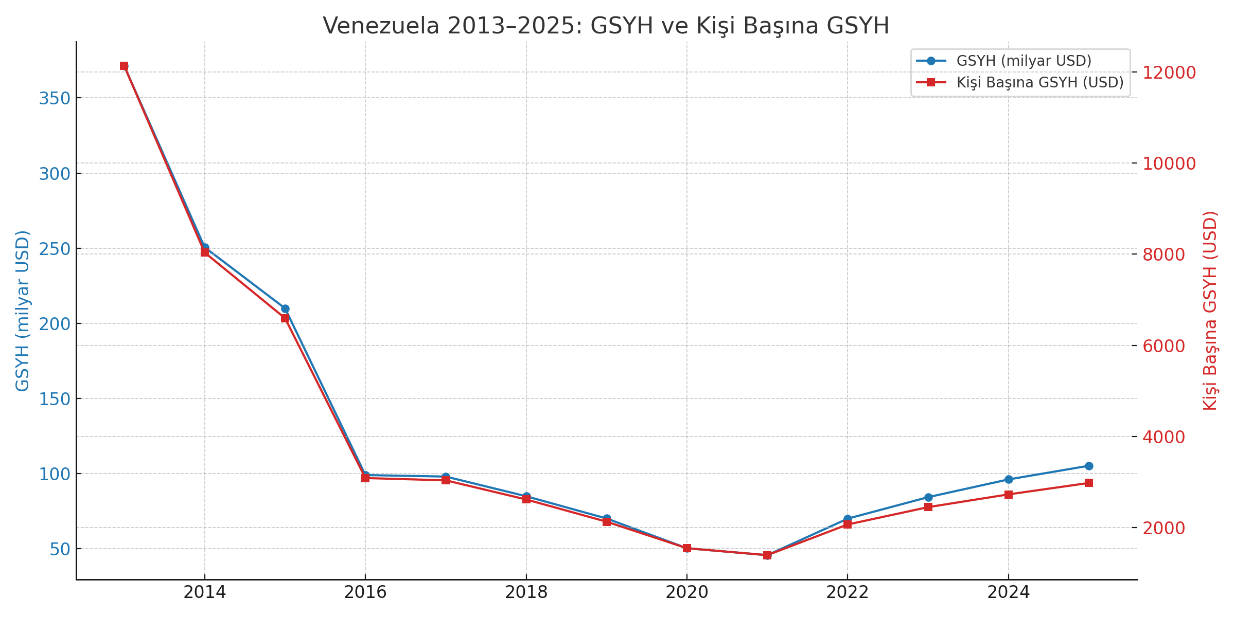 2014–2025 arasında Venezuela ekonomisi, petrol fiyatlarındaki çöküş, hiperenflâsyon, politik kriz ve uluslararası yaptırımlar gibi etkenlerlebüyük dalgalanmalar” yaşadı. 2025 için IMF’nin belirttiği 108.5 milyar dolar değeri, görünürde 2022 ve 2023 toparlanma sürecinin hâlâ “kırılgan” ve “sürdürülemez” olduğunu ortaya koymaktadır.